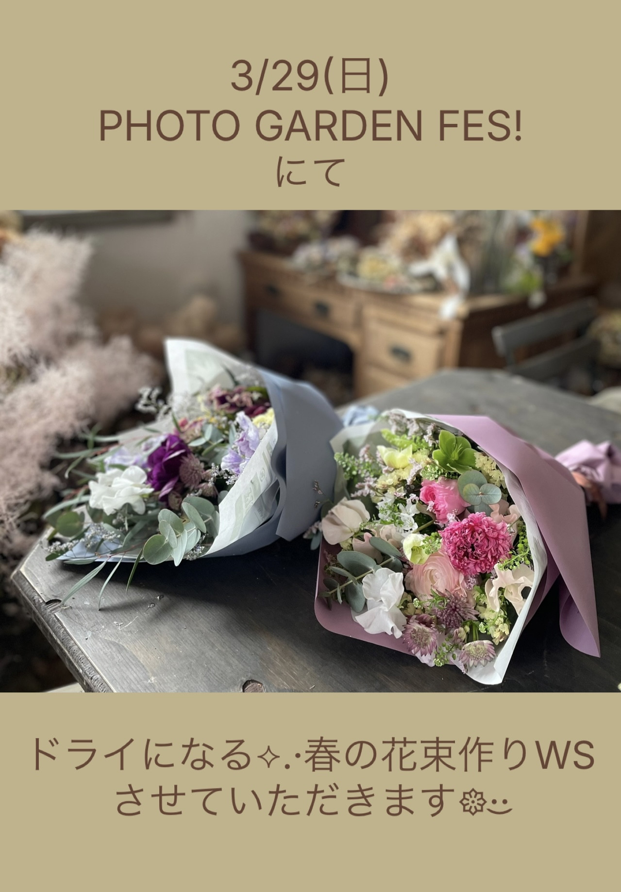 3/29(日)、ご近所のPHOTO GARDENさんが開催されるイベントに、faveur.花もワークショップで参加させていただく事になりました😊